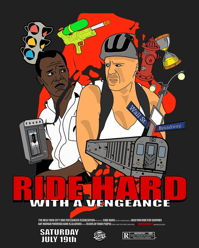 The New York City Bike Messengers Association is doing a bunch of events this month, starting with a 13-mile race down Broadway this Friday. But none caught my attention like Ride Hard, an alley cat themed around the Bruce Willis vehicle. To participate, you’ll need to create a team with three other people, choose a team name, and create an Instagram profile page for your team that you’ll use during the event. Pre-registration will open a week before the event, which gives you about two more weeks to create your team!