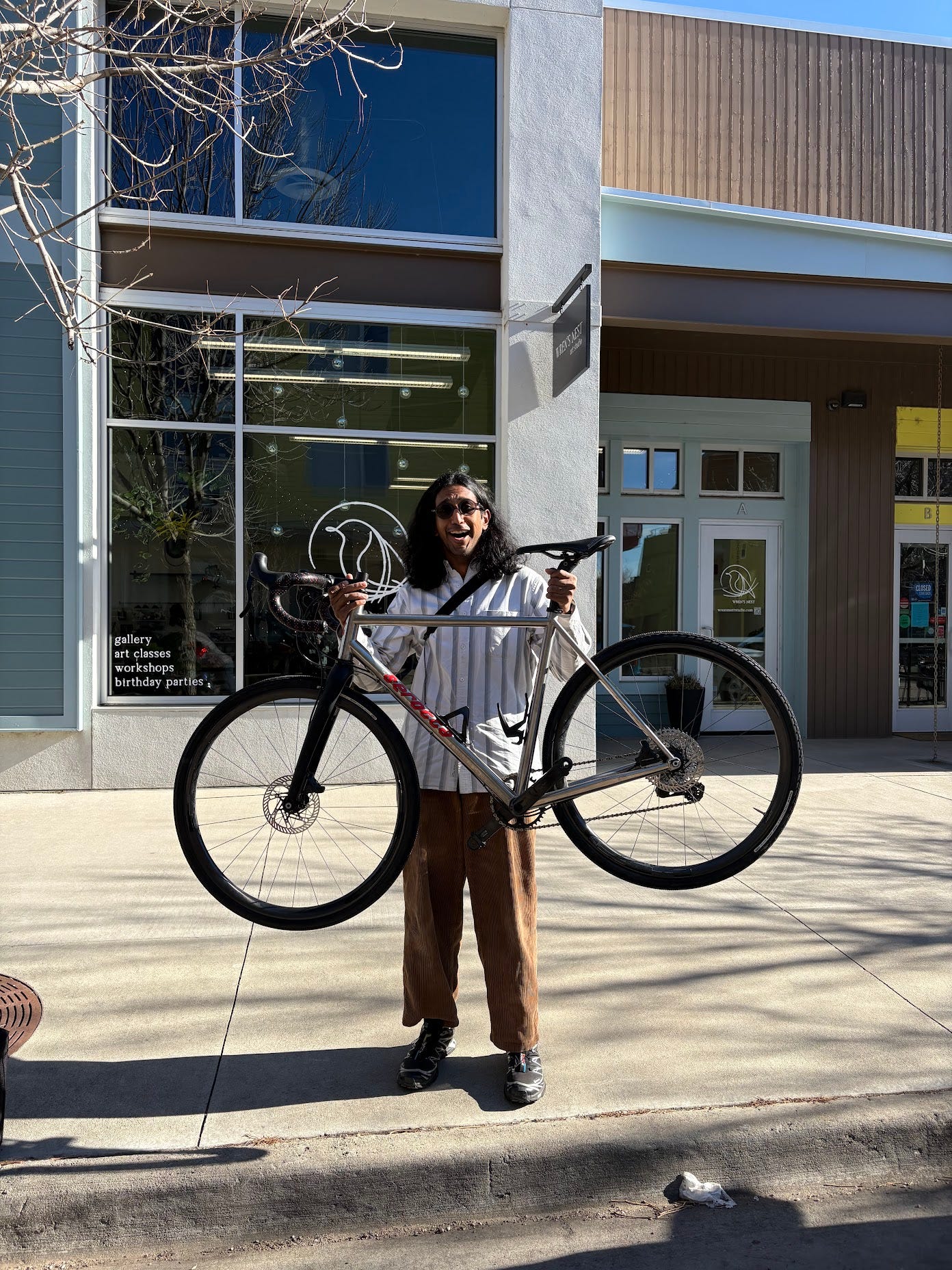 The first bike came courtesy of Cenna Custom Cycles in Longmont, Colorado. My father-in-law has been a customer there for a decade—there’s literally a photo of him on one of the walls. Owner Cenna Vaelli was there in the flesh when we stopped by shortly after the drive from the Denver airport. After a quick tour of the shop and friendly debate about whether e-bikes belong in New York City bike lanes (let me tell you, everyone has an opinion!), he pointed at a bike in the corner of his fit studio and asked me if I wanted to ride it for the week. I was floored. He was pointing to a Serotta gravel bike with a customized titanium frame, carbon fork, Panaracer Gravelking tires, a Campagnolo groupset, and a starting price of nearly $15,000. Like many owners of high-end bike shops I have encountered, Vaelli was jarringly casual about this. After making sure I wasn’t planning to huck it down any rock-ridden singletrack, he basically just sent me on my way with it. Wild! Thank you!